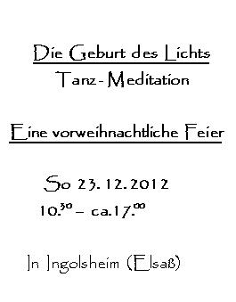 6, rue Eckhard, F-67250 Ingolsheim (Elsaß) – Nähe Wissembourg (Weißenburg)Zeit: Sonntag, 23. 12. 2012, 10,30 – ca. 17,00 Uhr.