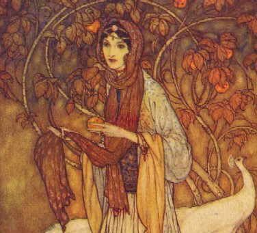 Es war wohl Mitternacht vorbei, da wurde das Klingen um sie herum leiser. Sie sahen über den Felsen ein fernes Leuchten, welches näher kam. Als das Licht bei ihnen angelangt war, erblickten sie eine wunderschöne Frau, welche fremdländisch gekleidet und kostbar geschmückt war. Unter ihren Schritten sprossen Blüten auf im Wüstensand, und die Kälte der Nacht verging.Christian fiel auf die Knie, faltete die Hände und rief: "Die Heilige Jungfrau! Rette uns, Notre Dame des Merveilles!" Juliette stand aufrecht und wusste nicht, was sie tun sollte. Sie dachte nur: "Wie schön die fremde Dame ist." Die fremde Frau lächelte und sprach: „Ich bin die Fee Peribanu, hier in den Felsen wohne ich im verborgenen Schloss. Was sucht ihr in meinem Land?“